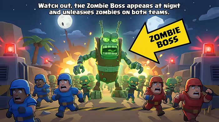 Brace for chaos, when night falls the ground cracks open and a swarm of zombies spills into the battlefield with a towering Zombie Boss leading the charge. It doesn’t care about red or blue, it just tears into anything that moves, forcing both sides to adapt fast, scramble defenses, and survive the unexpected third enemy that turns every match into pure unpredictable fun.