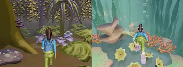 Shylake’s connected caves include a large forested area and an underwater lake biome. Enjoy foraging in the town's extensive food forest and lake bed, aided by tech tools to facilitate sustainable harvesting. Learn about the carefully balanced mix of organisms and their roles in the local ecosystem, and help the wildlife centers maintain that balance.