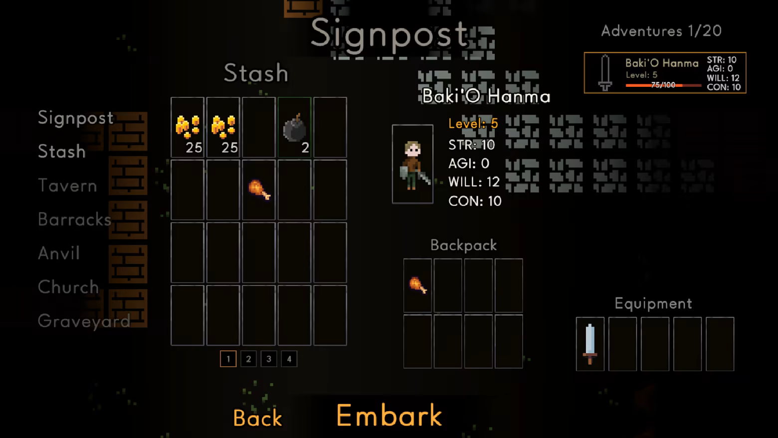 You control a hamlet that serves as your base of operations. Here you heal and strengthen characters, recruit new adventurers, buy equipment, and manage your stash — a persistent storage where items are kept only if a character successfully returns from an expedition.
