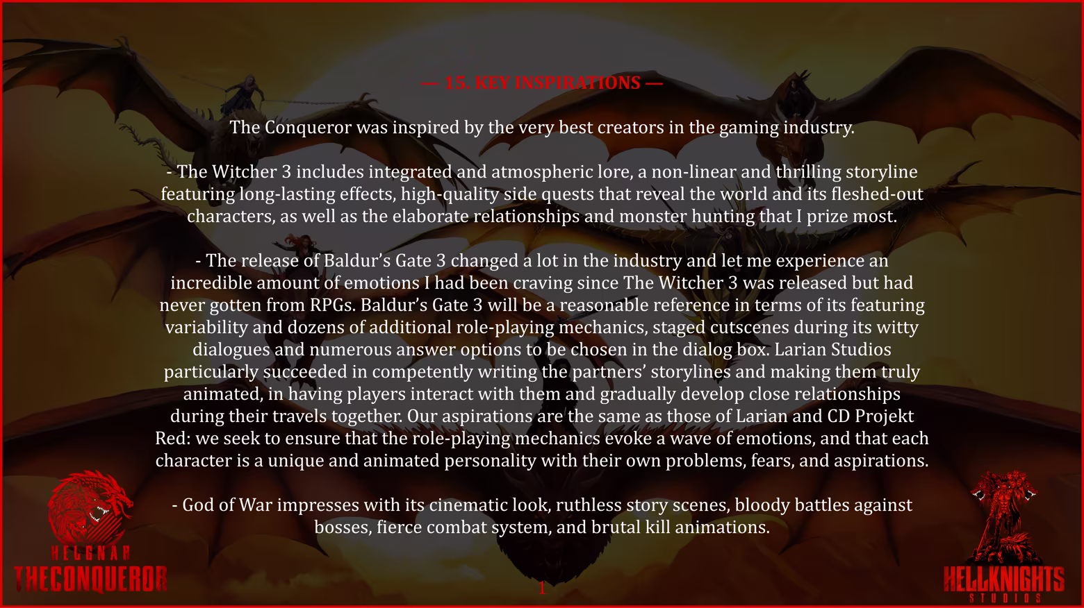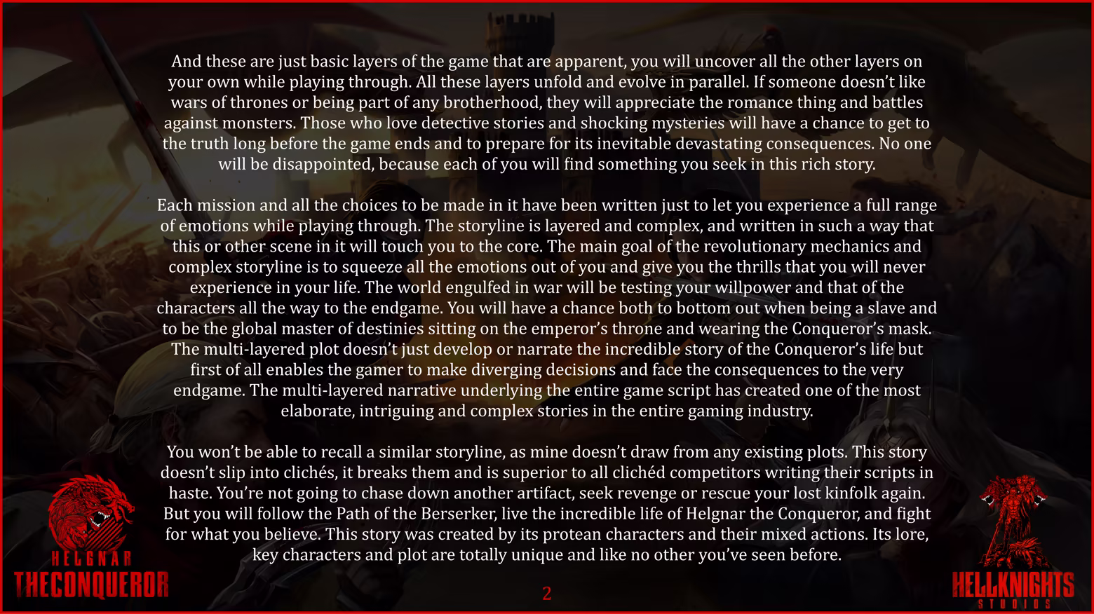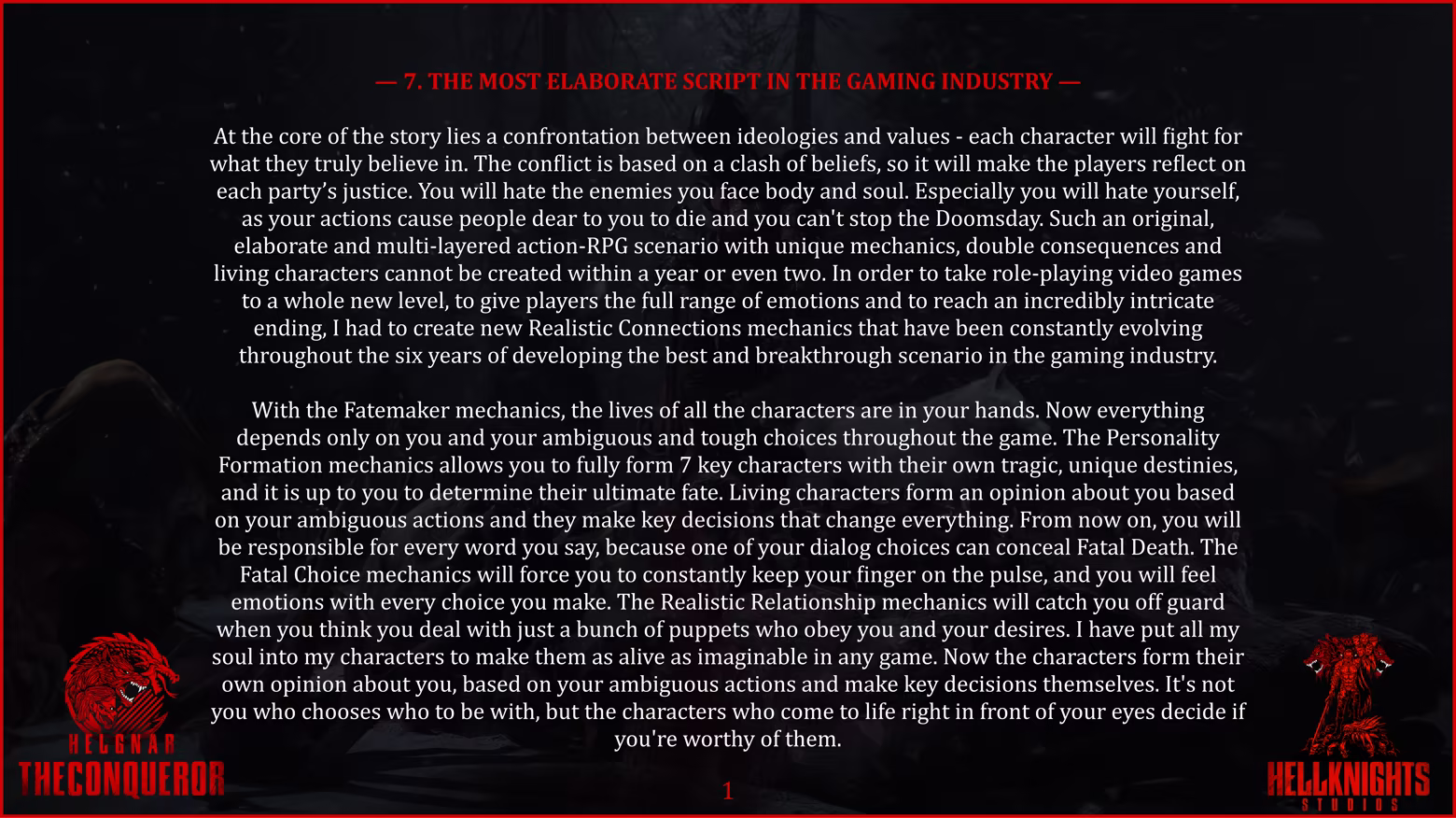 Welcome to all who have stepped onto the Path of the Conqueror in the name of the Age of Change. I am Danred Dante Helknight, Game Director of the indie studio Hellknights. The developers of video games God of War and DOOM saved my life, and since then, I swore to dedicate it to creating truly living characters and extraordinary worlds that can inspire and save others, gifting them indescribable emotions. Thanks to them, I realized my main goal in life, and over six years of detailed development of the multi-layered script for the Action-RPG Helgnar The Conqueror, I created more than ten new innovative narrative systems aimed at the evolution of the genre.