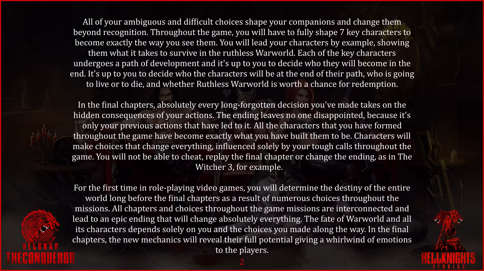 - Hellknights Studios offers something completely new to the industry - the Personality Formation mechanics. Throughout the game, you make difficult, ambiguous moral decisions and subtly influence the characters traveling alongside you. Each of the 7 key profound characters goes through their own paths of formation, changing in front of your eyes and it is only up to you to determine who they will become at the end of their brutal path. You will face the toughest choices in your gaming life and you will have to choose what is more important to each of you - the development of your favorite character or the many lives of those around you.