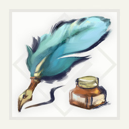 A fountain pen with a blue feather gifted by Fiorayne. Awarded for hunting the Lunagaron.