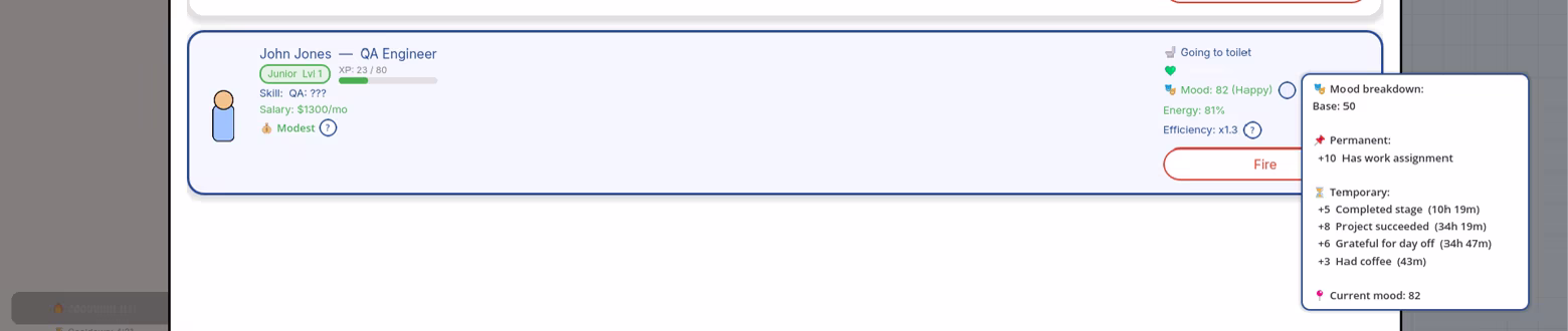 ⏰ A Race Against Time The workday is relentlessly ticking away, and the release is at risk. Make tough calls: send the team home to rest and accept a failed sprint, or force everyone into overtime, risking mass resignations due to stress.