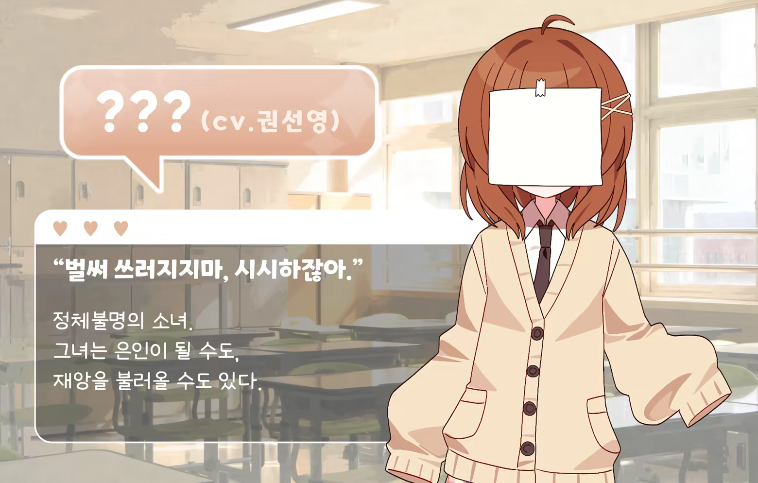 귀여운 걸 보면 죽는 병에 걸렸다. 깜찍함이 가득한 세상에서 살아남기란 쉬운 일이 아니었다. 은둔 생활을 시작한지 2년, 졸업을 앞둔 어느날 온 연락 한 통. “나 졸업하면 이사 가. 인사라도 제대로 할까?" 2년간 짝사랑했던, 홍온설. 졸업까지 남은 시간은 3일. 아직 전하지 못한, 전해야만 할 마음이 남았다. 학교로 돌아가 위험천만한 고백에 성공할 수 있을까? 끝없는 위협을 적절한 선택으로 돌파하여, 엔딩에 도달해야 하는 로맨틱 코미디 비주얼 노벨입니다.