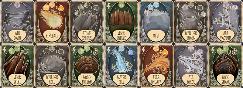 Use hexagonal tiles with elemental resources (fire, water, wood, stone, and air) to cast powerful spells.